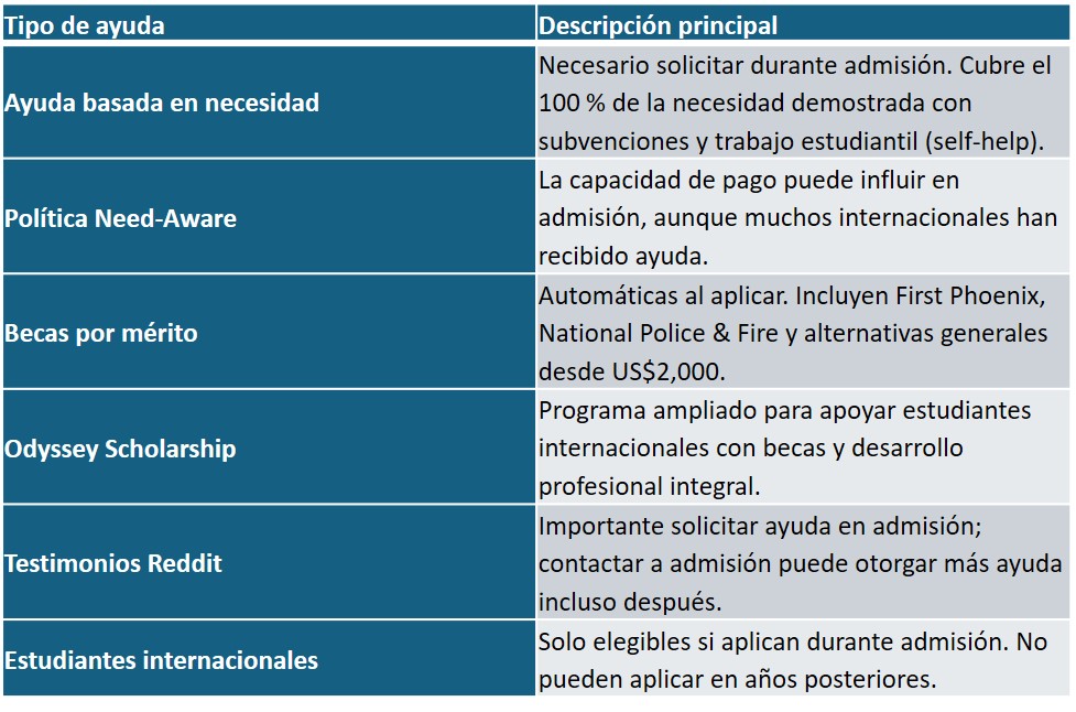 La universidad ofrece ayuda financiera basada en la necesidad (need-based aid) a estudiantes internacionales admitidos que demuestren una situación económica justificable. Esta ayuda puede cubrir hasta el 100 % de la necesidad financiera.